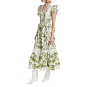 ONLY AT SAKS. The Milani printed maxi dress by Farm Rio is crafted of cotton, flaunting embroidered flutter sleeves and a peplum accent. A smocked bodice and a sweet self-tie complete the look.