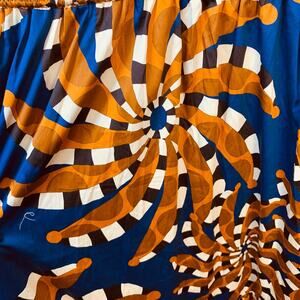 Mixed bandana print of pinwheals in browns, white, navy, black white & yellow