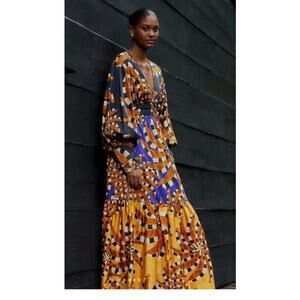 Farm Rio Mixed Bandana Long Sleeve Deep V Neck Maxi Dress - Size XS