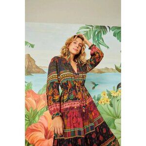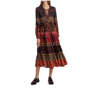Farm Rio Mixed Patchwork Midi Dress Boho Floral Long Sleeve Tie Waist XS