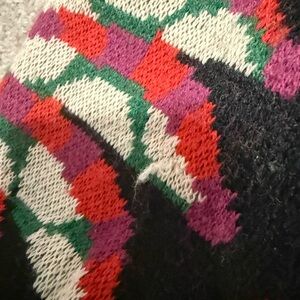 Eye-catching multicolor knit sweater with bold abstract pattern. Comfortable ribbed crew neckline and cuffs for a secure fit. Slightly cropped silhouette for a modern look. Features vivid red, green, purple and cream accents on a black background. Good condition, slightly worn. Very warm, wool blend and perfect for colder weather.