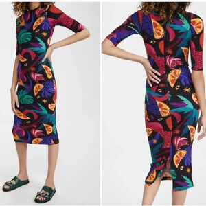 Farm Rio Mystic Jungle Dress 3/4 Length Sleeve Bodycon Size XS Zipper Back