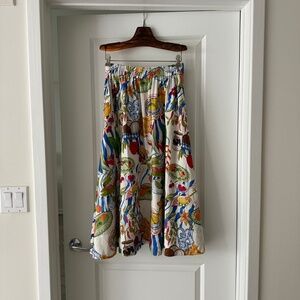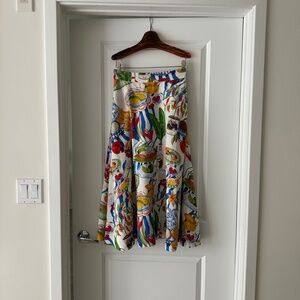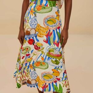 The Off-White Fresh Table LENZING™ ECOVERO™ Euroflax™ Midi Skirt by FARM Rio is a vibrant celebration of color and playful design. Featuring a delightful mix of tropical prints with fruits and plants, this skirt captures the essence of sunny days. Crafted from responsible materials, its flowy silhouette invites movement and joy, making it a charming addition to your wardrobe. A touch of Brazilian summer for any occasion.