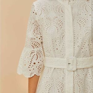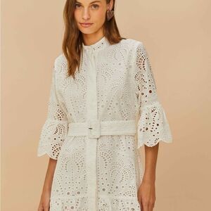 This elegant white eyelet dress is perfect for any occasion. Featuring intricate detailing and a flattering fit, it's a must-have for your wardrobe. Embrace the charm of the off-white palm tree mini dress by FARM Rio. This delightful piece features intricate eyelet fabric, a playful palm tree pattern, and flattering bell sleeves that add a whimsical touch. The high neckline and tailored waist create an elegant silhouette, while the scalloped hem adds a playful twist. Perfect for moments that call for warmth and elegance, this dress is a must-have treasure. Composition