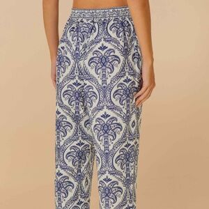 Featuring a relaxed fit adorned with an intricate tropical pattern in calming shades of blue and off-white, these pants evoke a sense of playful tranquility. The soft, flowing fabric and tailored waistband merge comfort with style, making them a delightful addition to your wardrobe, crafted from responsible materials for a thoughtful touch.