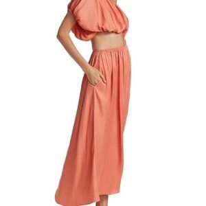 Farm Rio solid dress with asymmetric neckline. One-shoulder neckline. Short sleeves; elastic cuffs. Open waist. A-line silhouette. Hem falls below the knee.