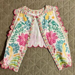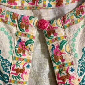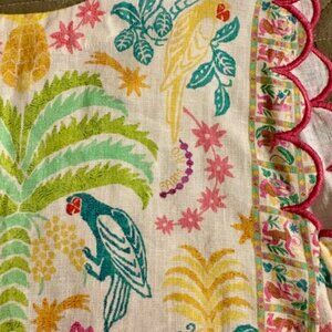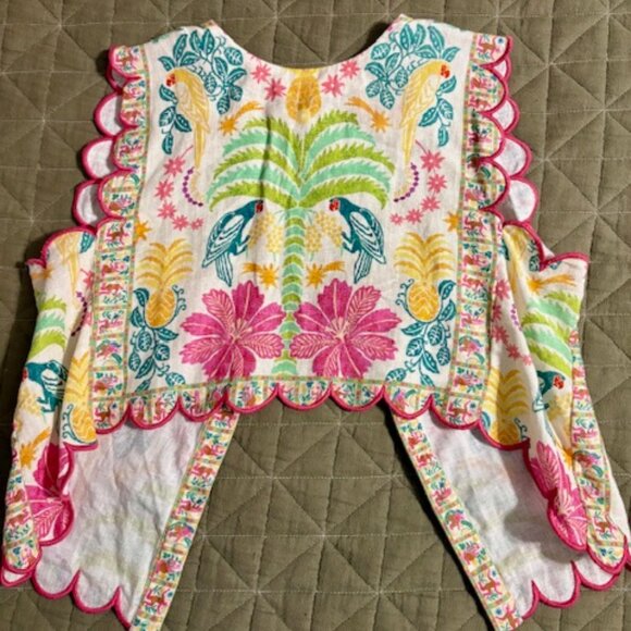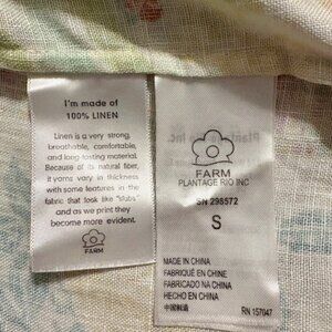 This Farm Rio Open Back top, size small, is 100% linen. Cut in a hi-lo silhouette with scalloped edges, Farm Rio's top is adorned with a vibrant motif. This item is like new!