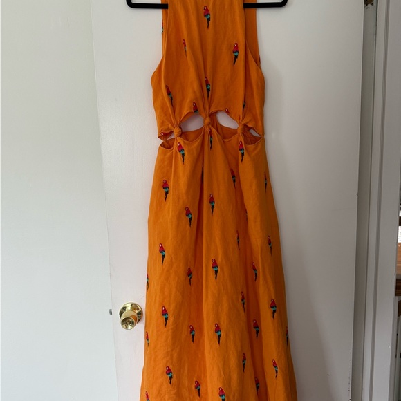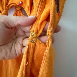 Super cute and unique dress! The parrots are all embroidered. The only modification to this dress is that I added an extra hook (2nd pic) right by the zipper. Other than that, it’s basically brand new. Only worn once. Also: pockets!!!