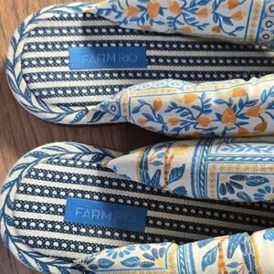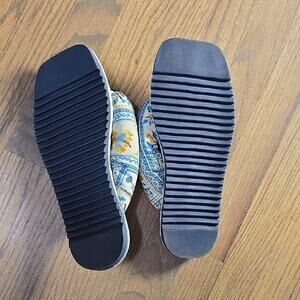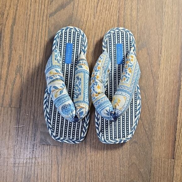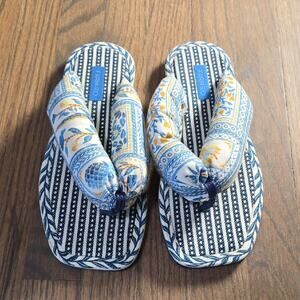 Stylish flip flops with a unique pattern. Features blue and yellow designs. Minimal wear.