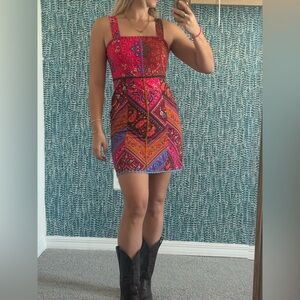 Bold dress with striking multicolor patterns. Perfect for a standout look.