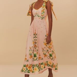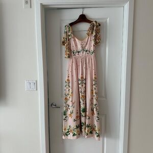 New with tags, never worn. Embrace a touch of tropical elegance with the Pink Botanical Beauty Shoulder Bow Midi Dress. This enchanting piece features a playful square neckline and whimsical shoulder bows, all adorned in a lush botanical pattern. Soft pink fabric serves as the canvas for vibrant floral motifs, creating a captivating silhouette that dances with every step. Let this dress be your invitation to a world of effortless charm and joyful sophistication A28