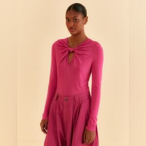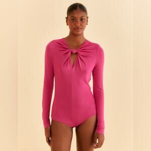 Farm Rio Pink Long Sleeve Knot Twist Key Hole Neck Zip Up Bodysuit M