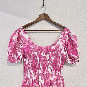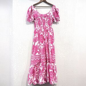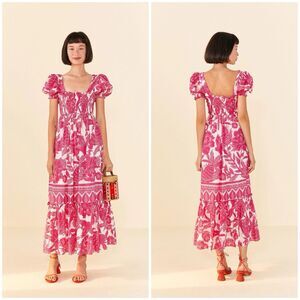 Farm Rio Pink Tropical Maxi Dress Size Medium Cotton Tiered Ruffle Puff Sleeve
