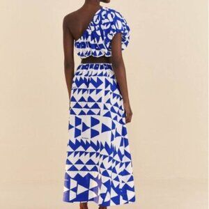 Farm Rio “Pitta Tiles” One‑Shoulder Maxi Dress • NWT • Off‑White / Blue Tile • L