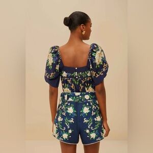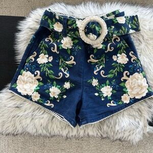 These are the FARM Rio Navy Blue Flower Tapestry Shorts, which feature a high-waisted design, a removable belt with a round buckle, and distinctive white floral embroidery with scalloped trim. They are crafted from a lightweight, non-stretch cotton twill fabric.