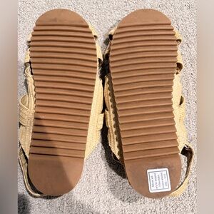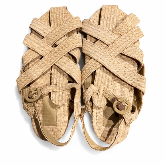 Farm Rio Lightweight woven raffia sandals with crisscross straps. Buckle ankle strap for a secure fit. Neutral natural color perfect for warm-weather outfits. Slight damage where it buckles, barely worn!