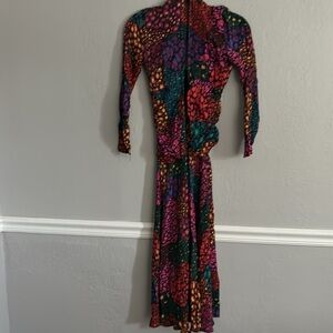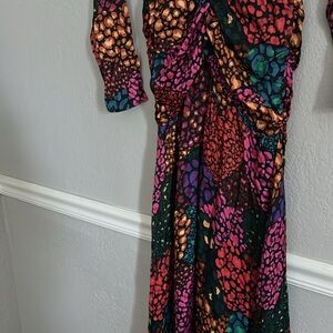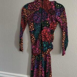 NWT XS women’s Farm Rio Rainbow Hearts Ruched midi dress. Green, pink, blue, gold, green vibrant colors. Beautiful print, designer. This dress has a broken zipper and it will need to be replaced. Price reflective of repair needed.