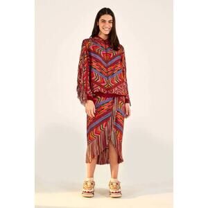 Keywords: Farm Rio jacket, fringe bomber, multicolor stripe coat, statement jacket, boho chic, festival fashion, XS jacket