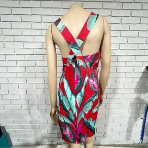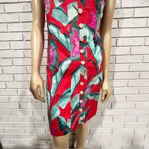 Step into the vibrant embrace of the Red Summer Foliage Mini Dress, a tropical treasure with a flirtatious sweetheart neckline. This mini dress captivates with its lush red hue adorned by a vivacious green and pink leafy pattern, embodying the spirit of summer. The criss-cross back straps add a playful twist to the silhouette, while the soft wooden button front complements the dress's warm, natural charm. Perfect for sun-soaked days or balmy evenings, this dress is an ode to the carefree joy of the season.
