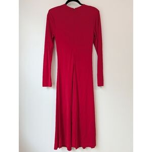 Crafted in a timeless red hue, it's designed with a gently flared midi-length skirt that sways with your every move. Long sleeves add a touch of sophistication, making it perfect for transitioning from day to night with effortless grace.