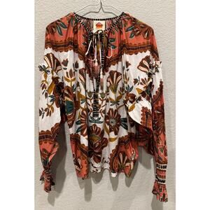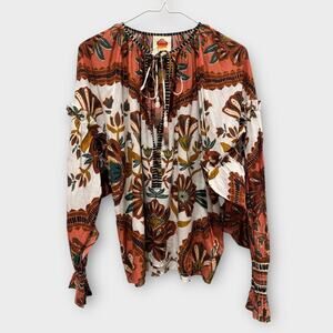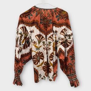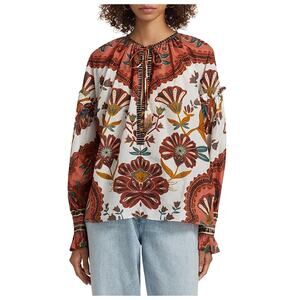 Earthy tones distinguish the blossoming flowers that pattern this split-neck top framed by blousy sleeves with smocked cuffs.