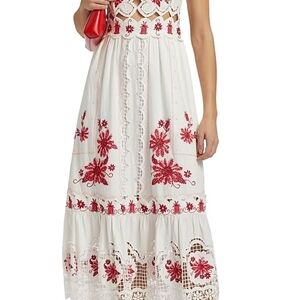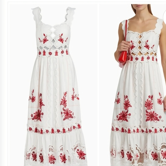 This Richelieu midi-dress from Farm Rio combines cut outs and sunflower embroidery on a luxe linen-blend canvas.