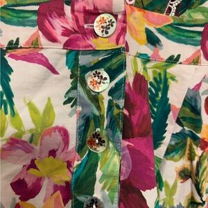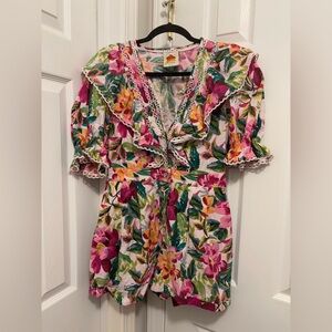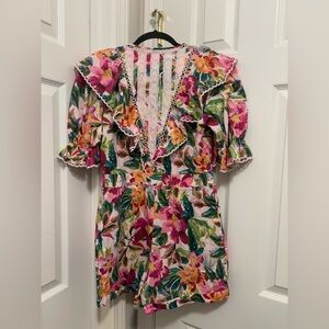 Vibrant floral romper featuring ruffle details. Pink and green accents add a lively touch. Missing belt.