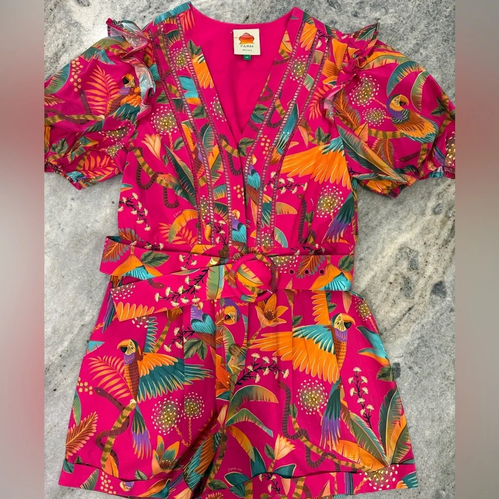 Gorgeous vibrant pink Farm Rio romper. Size medium with belt. Excellent condition.