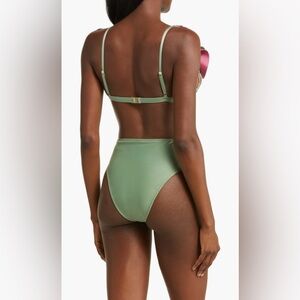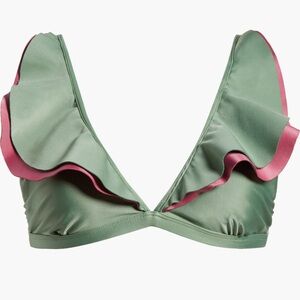 Flowy ruffles in emerald and rose hues draw attention to the center of this bikini top that's perfect for your next vacation.