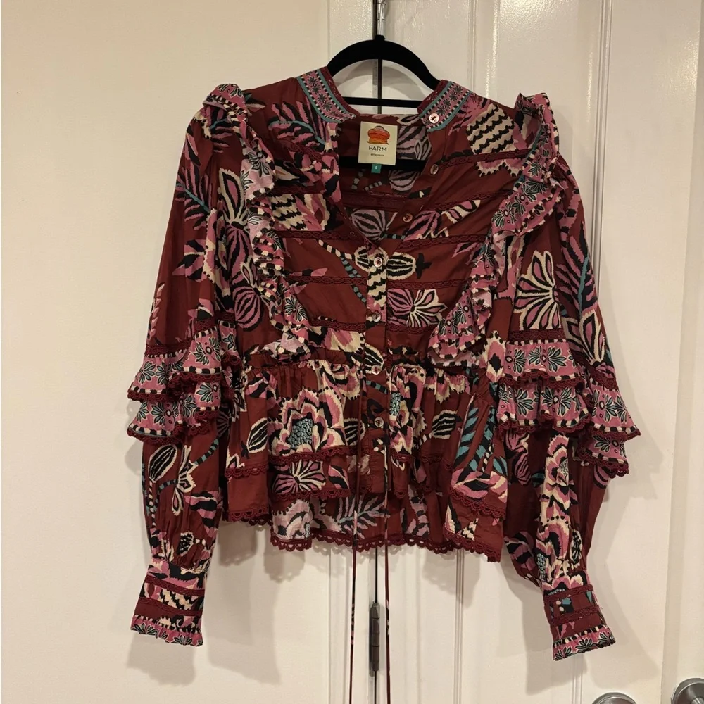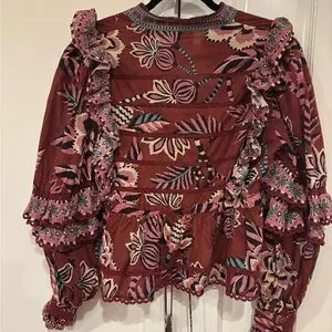 Chic burgundy blouse with floral patterns. Features ruffle details and lace accents. Perfect for stylish outings.
