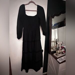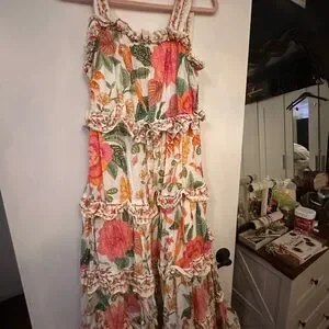 Beautiful floral maxi dress with ruffle details. Features vibrant pink and orange flowers on a white background. Midi length, gently used condition. Smoke free, pet friendly home.