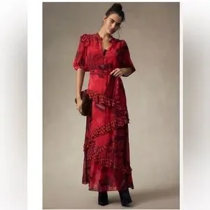 Step out in style with this elegant red floral dress. Perfect for any occasion, this dress features a beautiful floral pattern and a flattering silhouette. Ideal for making a statement. Like new condition.
