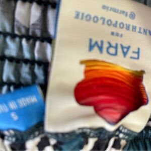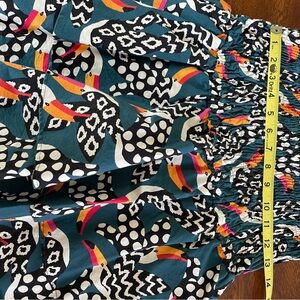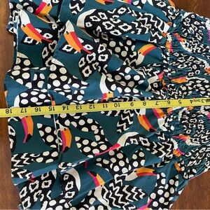 Super cute ruffled skirt. Blue/green teal background with black, white, yellow, red and pink. Elastic/smocked waist. 2 small tears near hem as shown.