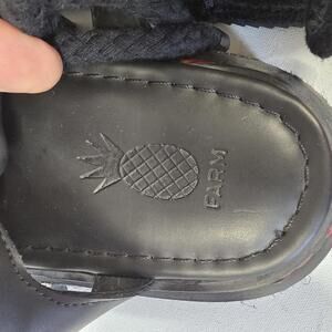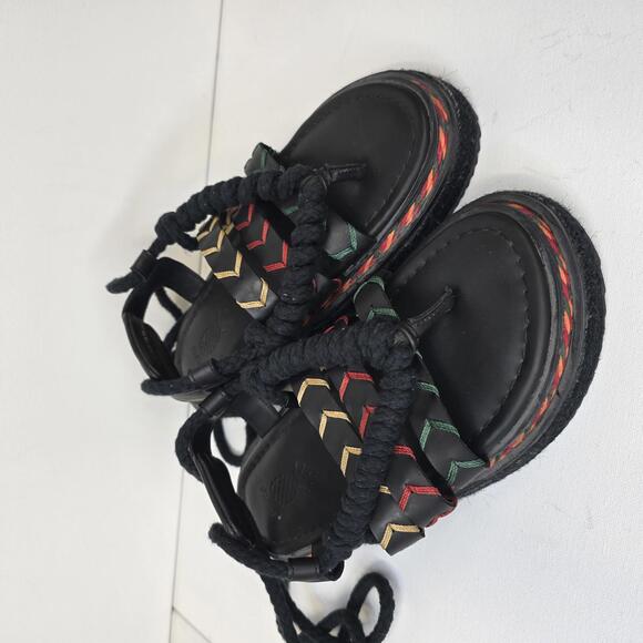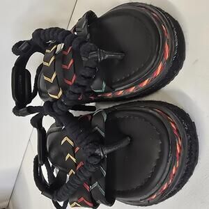 Black women's sandals with braided straps featuring red, yellow, and green chevron patterns.