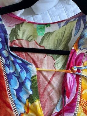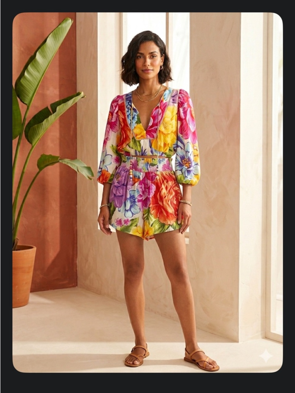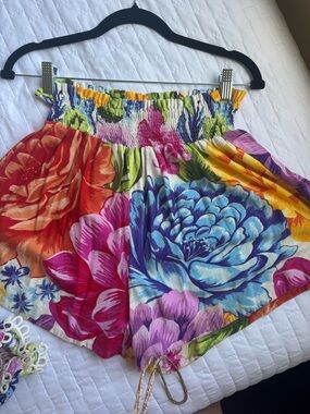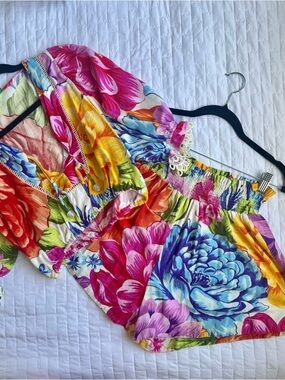 Bright floral top and smocked shorts.. Puff sleeves and relaxed shorts. Bold multicolor flower print. Lightweight, breezy 55% linen 45% viscose that provides the beautiful breather of the linen and the wrinkle protection of the viscose