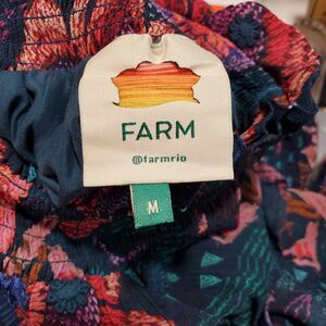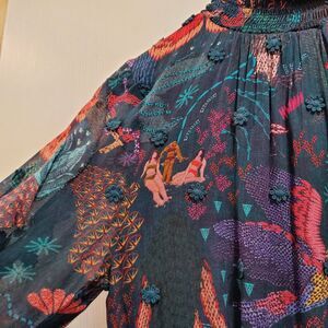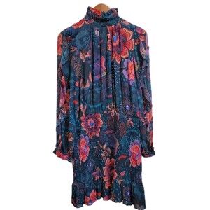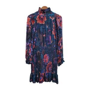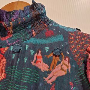 Farm Rio Size Medium Smocked High Neck Mini Dress Printed Ruffle Teal