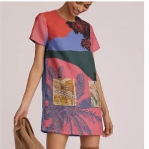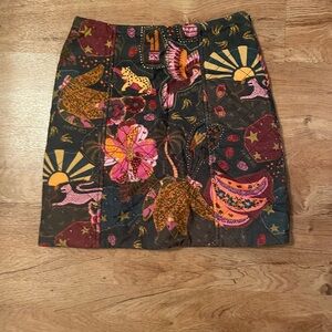 Vibrant Farm Rio skirt with a unique pattern. Features shades of pink, green, and brown.