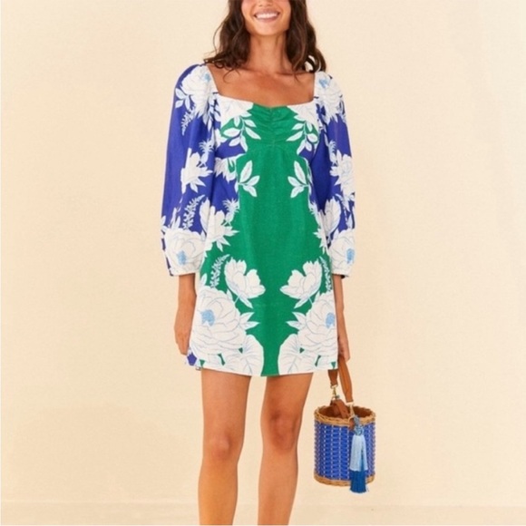 Farm Rio Soft Garden Linen Blend Puff Sleeve Mini Dress Floral Blue