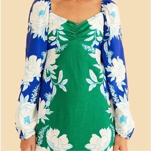 Farm Rio Soft Garden Linen Blend Puff Sleeve Mini Dress Floral Blue NWT Size XS