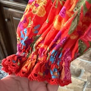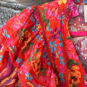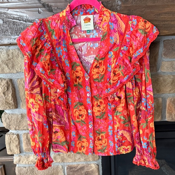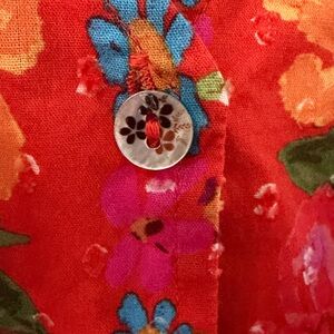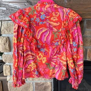 Pretty floral print. Ruffle features. Elastic cuffs. Button down. Pit to pit 18”, length 21”