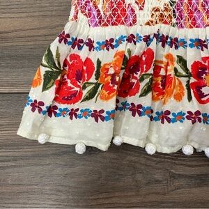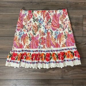 Farm Rio Spring Bananas Miniskirt NWOT This smocked Farm Rio miniskirt features a bright floral print and a ruffled hem finished with a pom pom trim. Smocked waistband. Pull-on style.