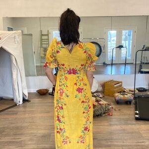 Stunning Farm Rio yellow maxi dress with vibrant floral embroidery throughout. Features a flattering smocked bodice that provides stretch and shape, feminine puff sleeves, and a tie neckline with keyhole detail. Lightweight and flowy with beautiful movement—perfect for spring/summer, vacations, brunch, festivals, or garden parties.