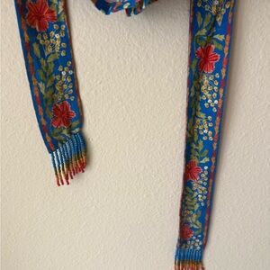 Vibrant floral sleeveless dress with a blue base. Features a colorful floral pattern.