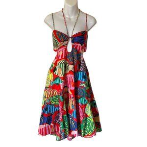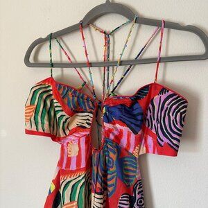 Farm Rio Stripe Fishes Mini Dress Womens Size XL Open Back Strappy Tropical Boho