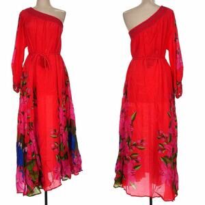 Drenched in a bold red hue, this one-shoulder piece boasts a flamboyant floral and parrot print that promises to turn heads. The flowing scarf sleeve adds a touch of effortless elegance while the maxi length skirt invites a graceful sway with every step. This dress captures the essence of sun-soaked days and balmy evenings, perfect for making memorable moments.
