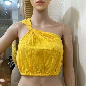 Bright yellow one-shoulder top with a stylish knot detail. Perfect for a sunny day.