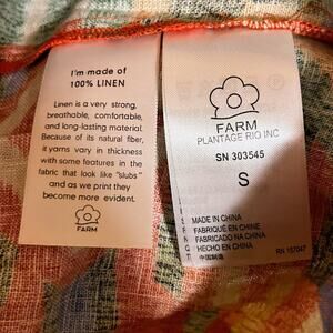 Farm Rio “Summer Patches” mini dress in 100% linen with a bold multicolor patchwork print. Features wide straps, square neckline, button-front closure, fitted waist, and flared mini length. Size Small.