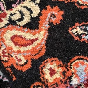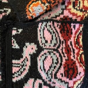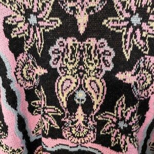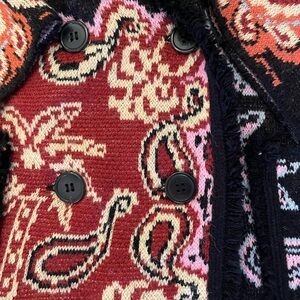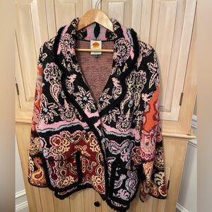 Farm Rio double breasted mid length sweater with black buttons, 2 pockets, and black trim. Love the colorful patterns in black, pink, orange, baby blue, yellow and burgundy. Beautiful quality! Excellent condition!