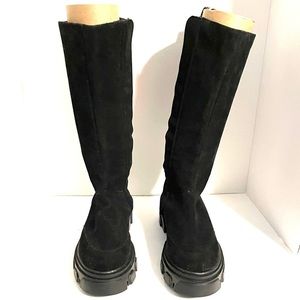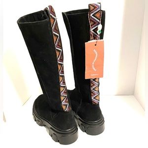 So cute but never wore, just removed tags. Farm Rio lug sole chunky black vegan suede like knee length boots with tribal ribbon detail at back. If you love a lug sole these are unique and well made. Size 7. Enjoy!