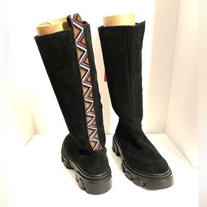 Farm Rio Tall Boot Lug Sole Black Tribal Ribbon MSRP $285 NWOT Sz 7 Vegan Suede